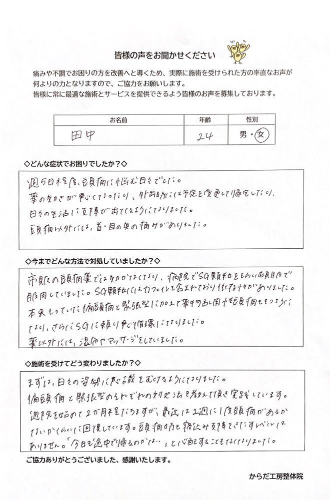 偏頭痛と緊張型頭痛のそれぞれの対処法を教えて頂き実践しています。通院を始めて2か月程たちますが、最近は2週に1度程度、頭痛があるかないかくらいに回復しています。