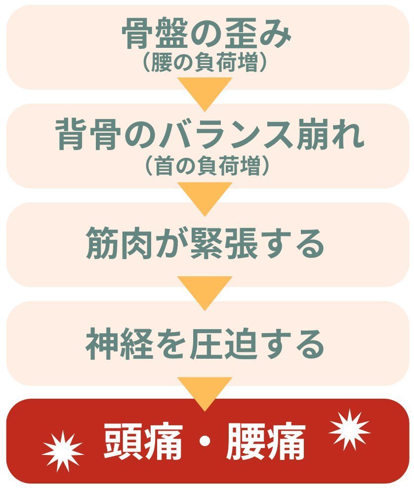 背骨や骨盤のバランスが崩れることで腰や首に余計な負担がかかり、筋肉・神経が圧迫されることで痛みが生まれます。